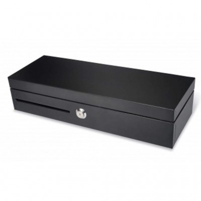 Сталеву грошову скриньку з вертикальною кришкою. Колір чорний. Має 6 відділень для банкнот та 8 – для монет та 1 відділення для документів A5 (чеків, рахунків). При зміні має функцію закриття на ключ змінної касети для безпечного транспортування до головної каси. Міцні металеві петлі забезпечують надійне закріплення верхньої кришки.