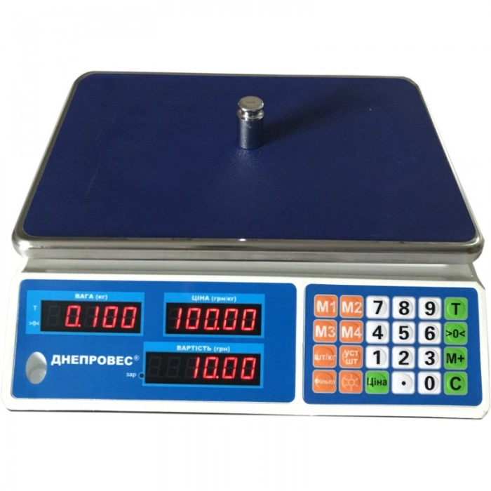 Ваги електронні настільні торгові до 6 кг Дніпровес ВТД-6Л2 точність 2 г, використовуються для зважування та розрахунку вартості товару. Ваги Дніпровес для торгівлі користується великим попитом у магазинах, ринку, прилавках, супермаркетах так і в багатьох закладах громадського харчування та торгівлі. Електронні торгові ваги Дніпровес представлені з різною межею зважування до 6,15,30 кілограма з точністю 1,2,10 грама, що дозволяє клієнту вибрати найбільш зручну вагу. Велика нержавіюча платформа ваг зручна для різної кількості продукту, що зважується. Наявність акумулятора у вагах дозволяє працювати вагам 50-200 годин без підзарядки, а автоматичний економний режим продовжить час заряду акумулятора. Особливістю є осередки пам'яті, які дозволяють продавцю легко та швидко працювати. Яскравий дисплей, з яким зручно працювати в приміщенні, символи чітко показують вагу і не напружує очі. Ми є офіційним представником ваговимірювальних приладів в Україні та надаємо якісний товар. Ми завжди дбаємо про нашого покупця. Перед продажем всі ваги проходять перевірку та калібрування. Надаємо тільки якісні та перевірені електронні ваги.
