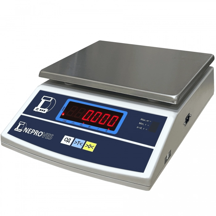Рекомендовані для контрольного зважування готової продукції у закладах громадського харчування, супермаркетах, на виробництві. Ваги настільні електронні Дніпровес ВТД-Т3 продаються з державною перевіркою. Представлена модель має чіткий дисплей, на якому відображаються великі символи.