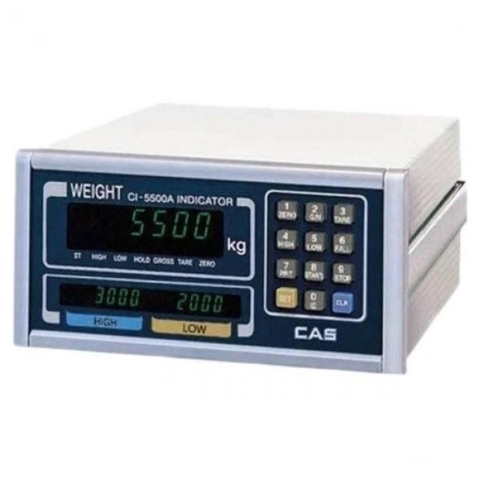 Ваговий індикатор CAS CI-5500A – застосовуються на професійному весоизмерительном обладнанні. Цифровий термінал здатний працювати одночасно з 8-ю тензометричними датчиками, проводити дворівневе дозування і має 4-ри програмованих релейних виходу. Завдяки вбудованим інтерфейсам передачі даних RS-232, RS-422/485 (опції) є можливість підключення до персонального комп'ютера. Вагові індикатори CAS CI-5500A оснащені 7-розрядним вакуумлюминесцентным дисплеєм з яскравим підсвічуванням. Корпус виконаний з антикорозійного алюмінієвого сплаву. Передня панель ваговимірювального обладнання володіє сучасною системою захисту IP54, яка виключає проникнення через конструкцію вологи і пилу. Експлуатація здійснюється від електромережі 220В.